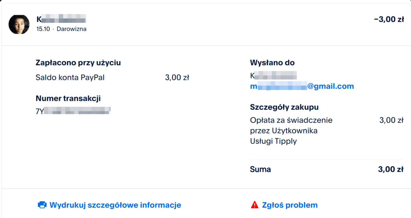 Tak wygląda transakcja w historii operacji w systemie PayPal z perspektywy Twórcy: