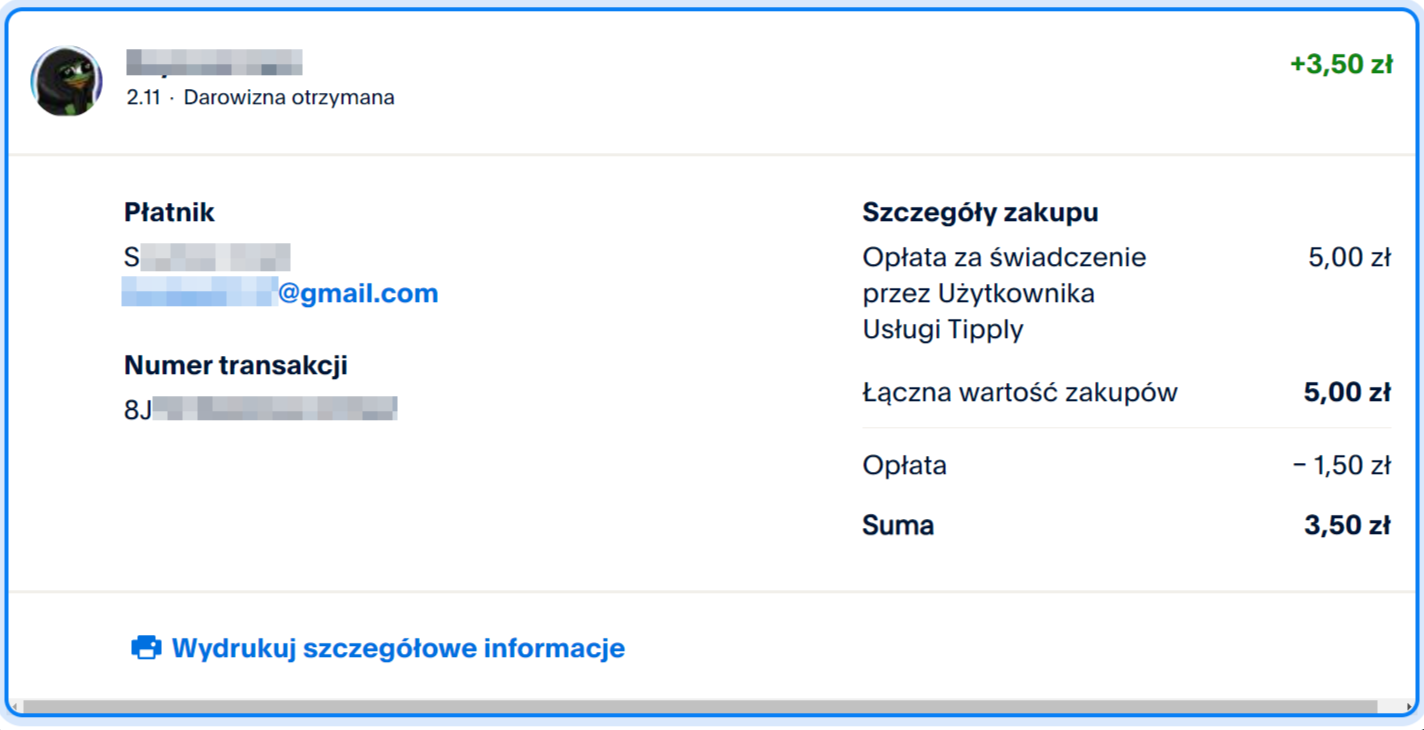Nie do końca. Widz zobaczy Twoją nazwę - zazwyczaj imię i nazwisko widoczne w PayPal oraz adres e-mail przypisany do Twojego konta w PayPal. I vice versa – Ty jako Twórca, widzisz te same dane, osoby wysyłającej do Ciebie płatność.