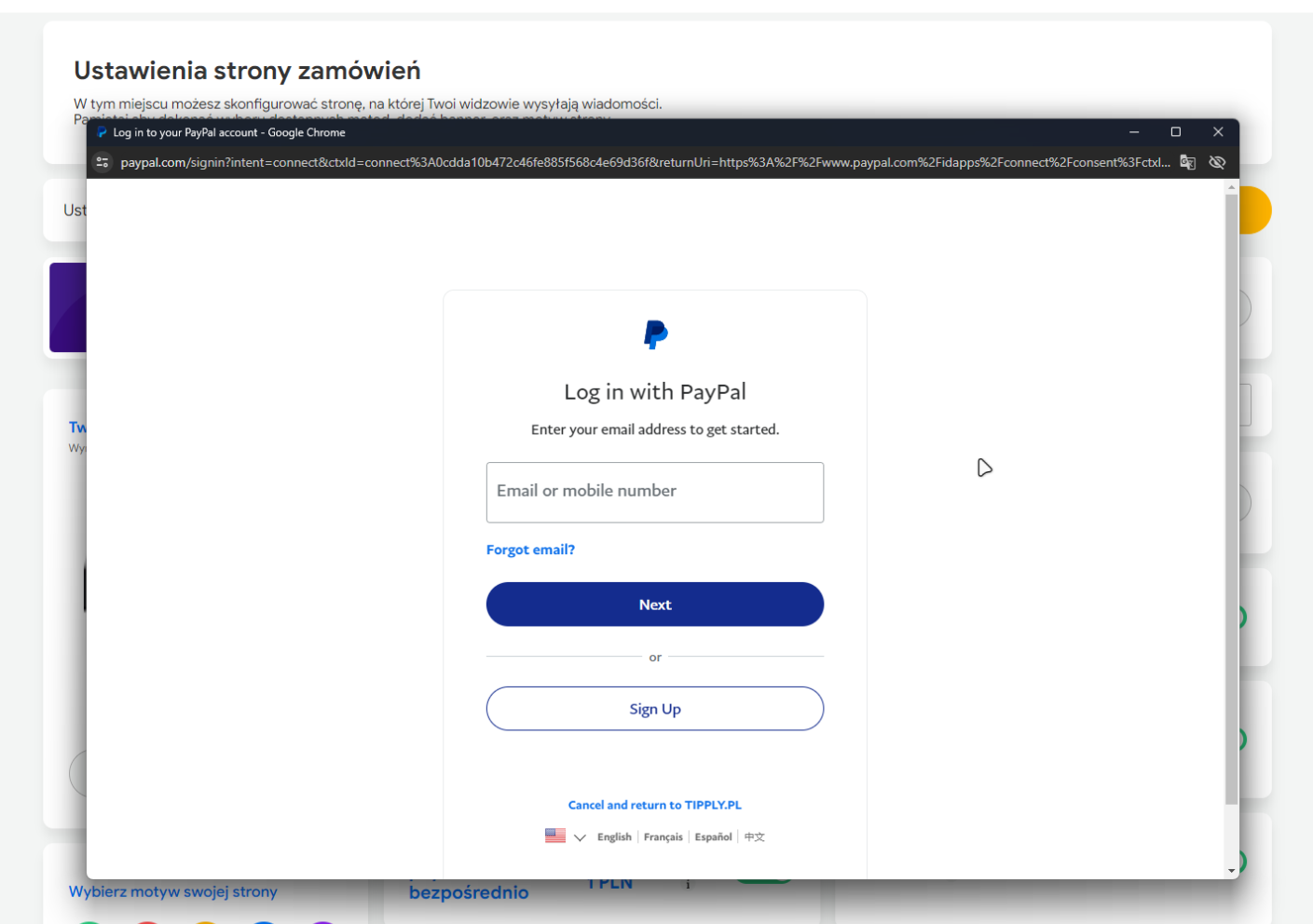Po kliknięciu przycisku “Aktywuj” lub “Zmień” w nowej karcie otworzy Ci się okno witryny paypal.com, w którym będziesz musiał(-a) zalogować się do swojego konta. Logujesz się wówczas w serwisie PayPal - Tipply nie otrzymuje ani nie widzi żadnych danych logowania - logujesz się wyłącznie po to, by przyznać w następnym kroku Tipply uprawniania do adresu e-mail podanego na koncie PayPal.